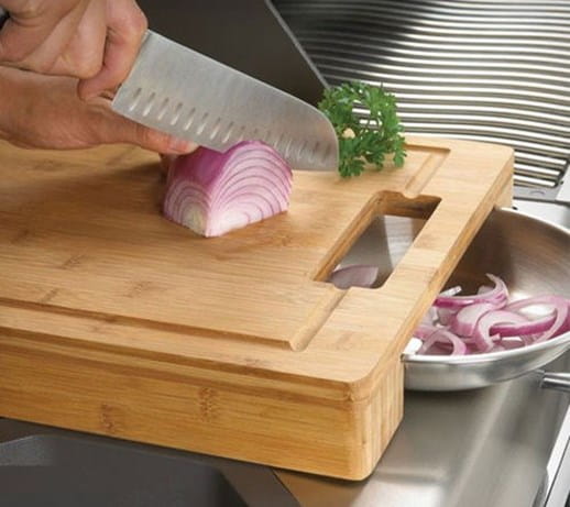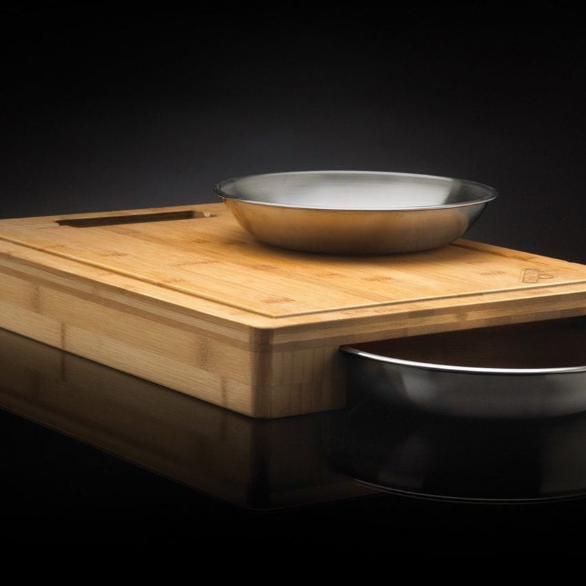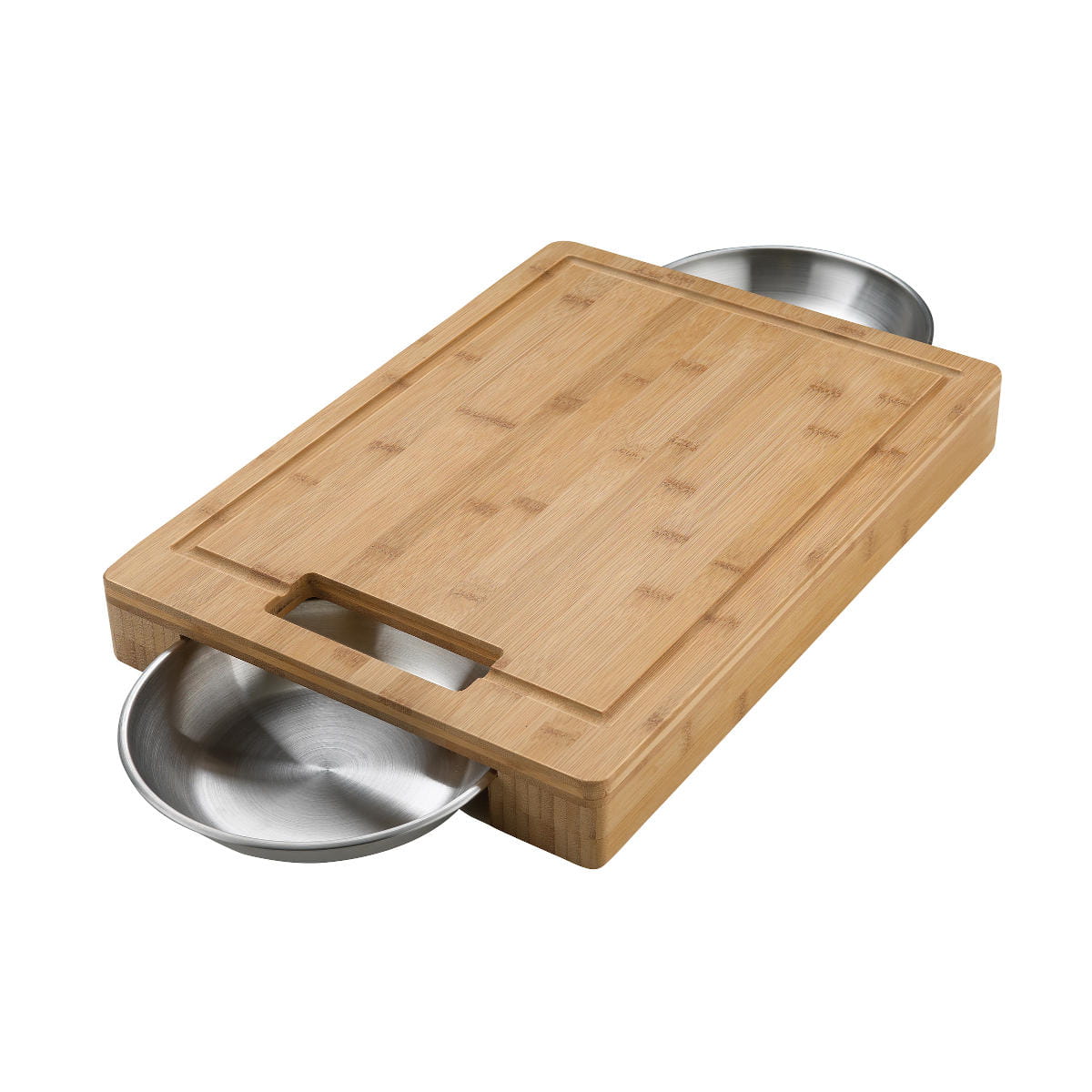 Deska do krojenia z miseczkami ze stali szlachetnej Napoleona jest idealna do przygotowywania potraw na grilla. Deska wykonana jest z ładnego i mocnego drewna bambusowego. Z dwóch stron zamontowano sprytnie dwie miski ze stali nierdzewnej. Pokrojone jedzenie można więc łatwo zsunąć do misek bez robienie bałaganu. Deska posiada również otwory na soki, np. z pomidorów, które spływają do misek.