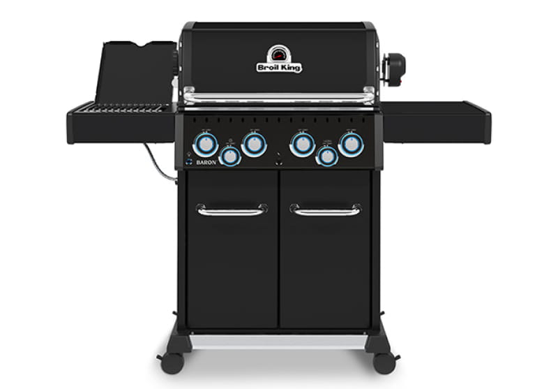 Grill gazowy Baron 490 IR Shadow to połączenie zaawansowanych funkcji, które gwarantują doskonały smak grillowanych potraw, z eleganckim i nowoczesnym czarnym wykończeniem. Komorowa budowa pokrywy piekarnika Therma-Cast™, dno z niewielką ilością otworów oraz cztery palniki Dual-Tube™ zapewniają równomierne rozprowadzanie ciepła przy niewielkim zużyciu gazu. Aromatyzery Flav-R-Wave™ nadają potrawom smak i intensywny aromat. Cztery dwustronne żeliwne ruszty Flav-R-Cast™ ustawiać można jednostronnie, na przemian, a w pozycji rynienkowej również pod kątem, co zapewnia skuteczne odprowadzanie tłuszczu. Grill Baron 490 IR Shadow posiada rożen obrotowy z dedykowanym palnikiem, idealny do pieczenia większych kawałków mięsa oraz palnik na podczerwień. Elementy grilla oraz stalowe drzwi zostały ocynkowane. Zapewnia to wytrzymałość i odporność na lata użytkowania, co potwierdzają długoletnie gwarancje. Pokrycie epoksydową farbą proszkową w kolorze czarnym sprawia, że grill wygląda niezwykle elegancko. Praktyczne elementy, takie jak podświetlane pokrętła oraz duże, składane półki boczne z haczykami na akcesoria, zapewniają wygodę użytkowania.