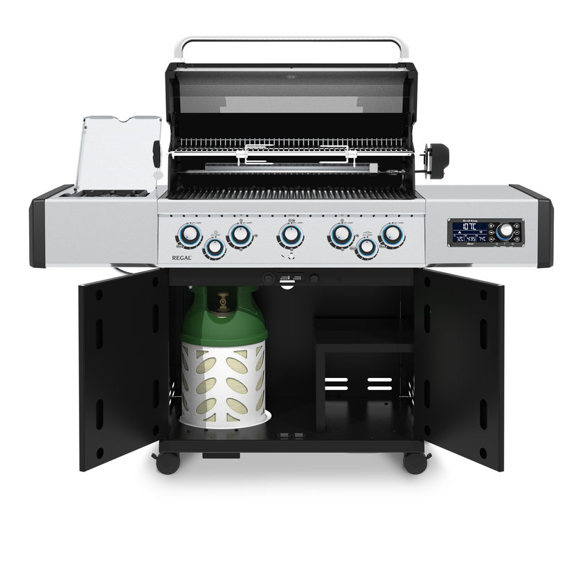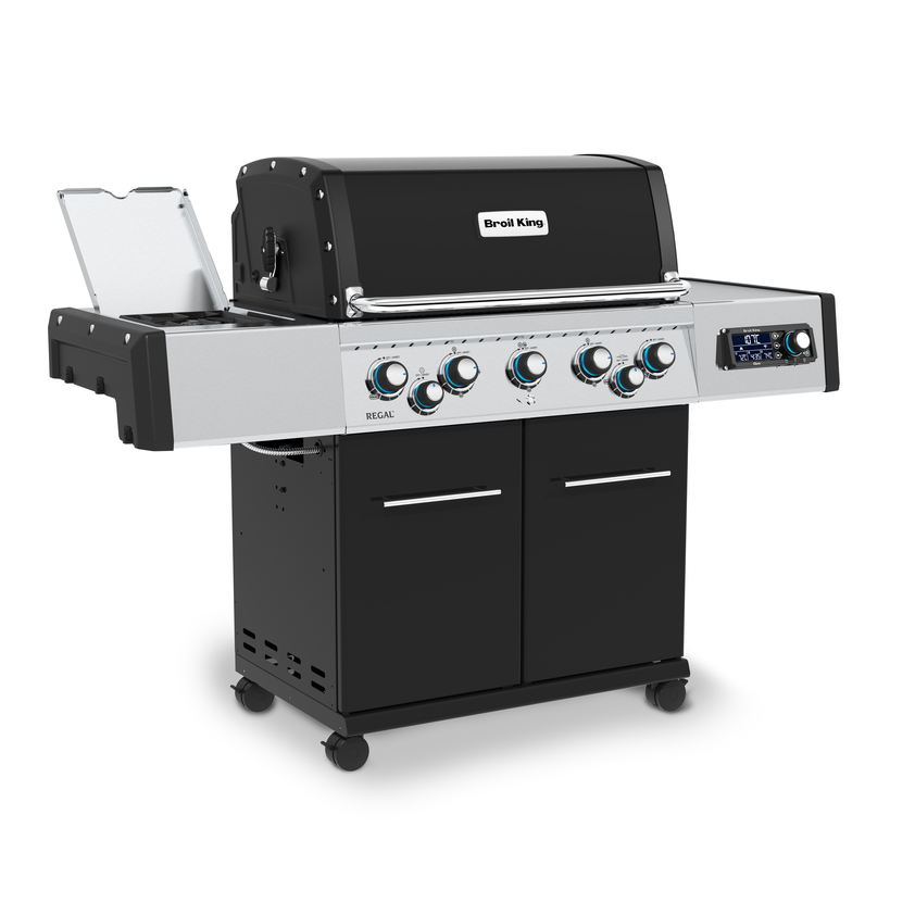 Grill gazowy Regal Q590 to połączenie elegancji z nowoczesnością za sprawą technologii iQue, która wprowadza nową jakość w świecie grillowania. Grill wyposażony został w zaawansowane rozwiązania Broil King: dwustronny ruszt Flav-R-Cast z odlewu z żeliwa Dura-Cast, aromatyzery Flav-R-Wave oraz oświetlenie wewnątrz piekarnika. Posiada również pokrętła Sensi-Touch z podświetleniem w kolorystyce palety barw RGB. Zarówno sterowanie jak i kontrolę grilla możemy wykonywać poprzez zdalną aplikację lub manualnie.