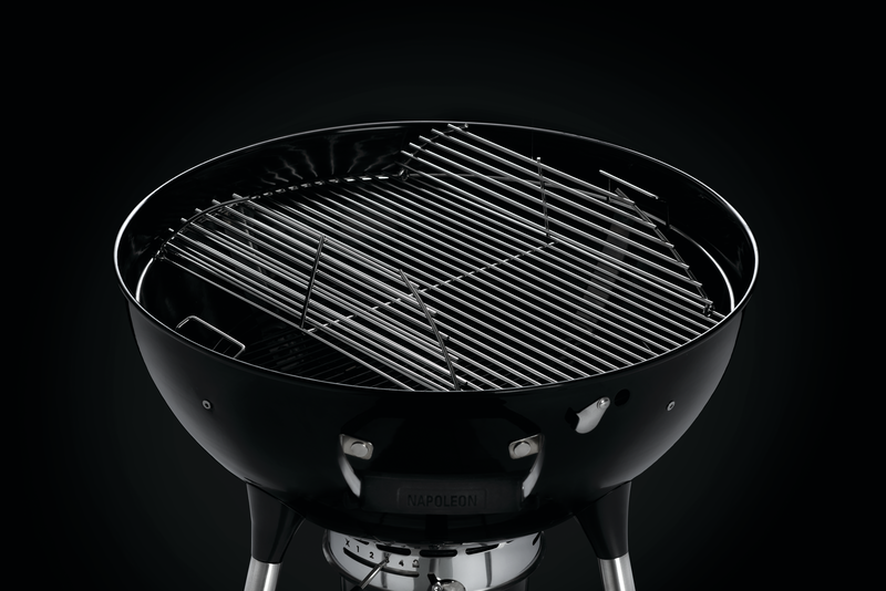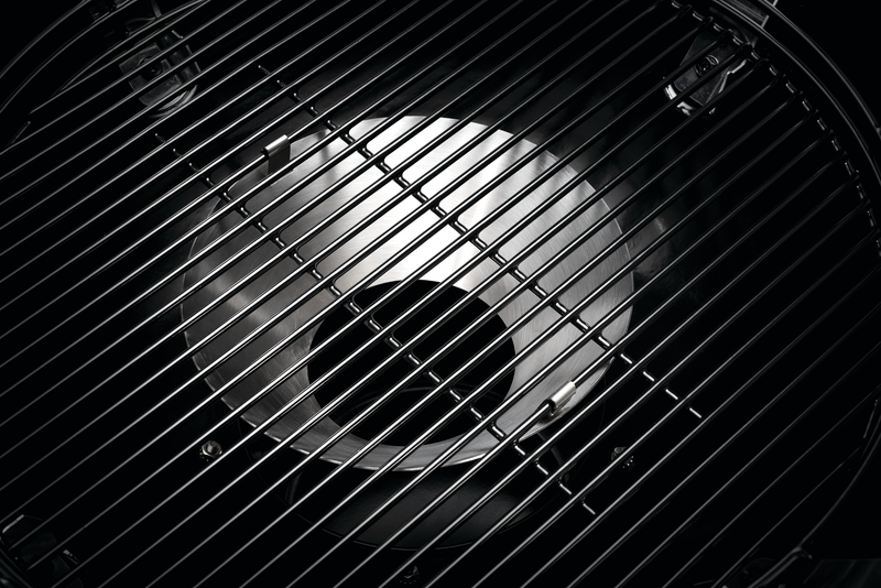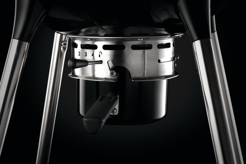Regulowane otwory wentylacyjne, które są chronione przed czynnikami atmosferycznymi, ułatwiają sterowanie przepływem powietrza w celu precyzyjnej kontroli temperatury. Ruszty ze stali nierdzewnej szybko się nagrzewają i wymagają niewielkiej konserwacji - pomieścić na nich można nawet 13 burgerów. Wyposażone są ponadto w zawiasy, aby umożliwić łatwe dodawanie węgla drzewnego. Zintegrowany termometr pomaga utrzymać idealną temperaturę podczas grillowania na wygodnej wysokości, dzięki ulepszonym złączom nóg, które zapewniają solidną stabilność i podwyższoną powierzchnię do grillowania.