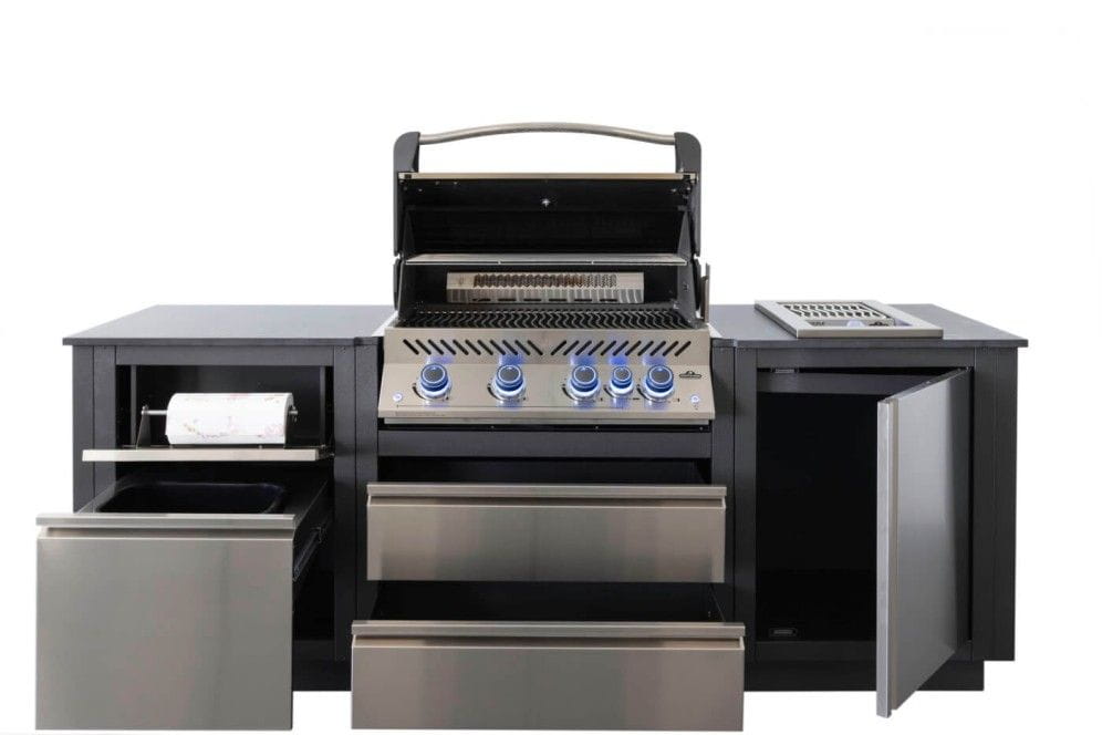 Kompletna kuchnia zewnętrzna OASIS Compact Prestige 500 jest idealna do każdej przestrzeni na świeżym powietrzu, zapewniając idealną ilość miejsca do przechowywania i pracy. Każda szafka została wykonana ze stali nierdzewnej, malowanej proszkowo w kolorze węglowym. Wysokiej jakiści blat o grubości 20 mm znanej włoskiej marki Marazzi jest bardzo wytrzymały. Kuchnia jest łatwa do zamontowania. Dostępne są wybicia pod instalacje elektryczne, gazowe, a także nóżki do poziomowania. Łączna powierzchnia grillowania wynosi 4645 cm2 (71 cm x 45 cm + ruszt do podgrzewania). Kuchnia posiada mnóstwo wygodnych schowków, zintegrowany uchwyt na papier kuchenny i wysuwany kosz na śmieci.