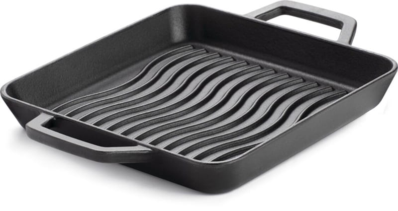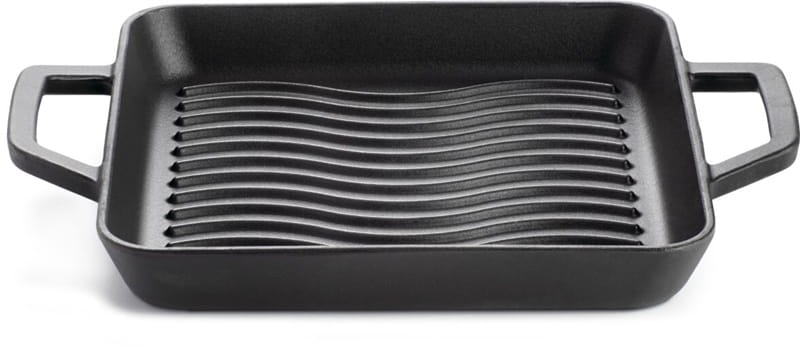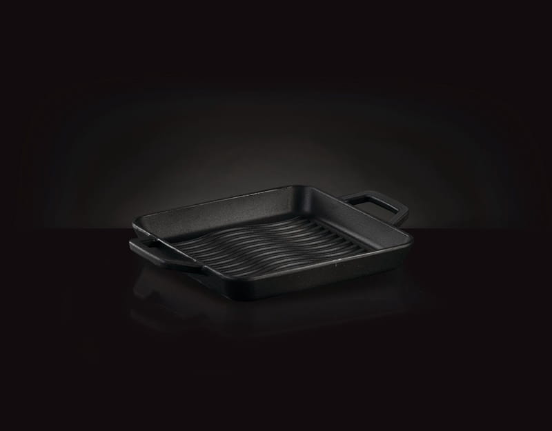 Patelnia została wyposażona w dwa uchwyty dla ułatwienia przenoszenia, żeliwo świetnie nagrzewa się i utrzymuje temperaturę. Karbowane dno w kształcie fal z których słynie marka, zapewnia uniesienie potrawy i odparowywanie wypływających soków i marynat.