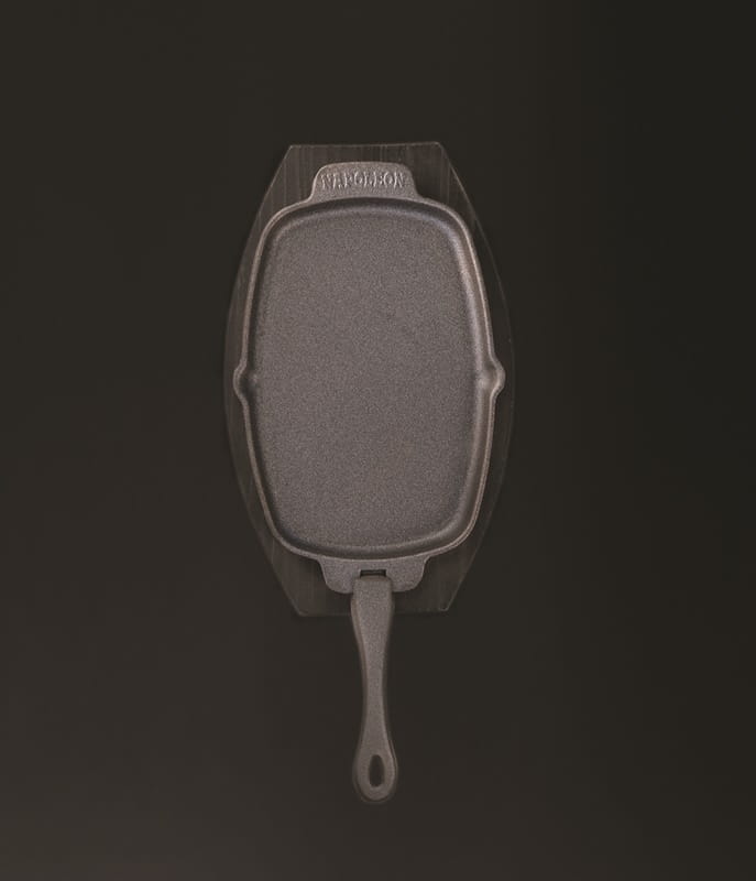 Żeliwna patelnia z odczepianą rączką pozwala na wygodne przenoszenie i grillowanie, w zestawie z drewnianą podstawką.