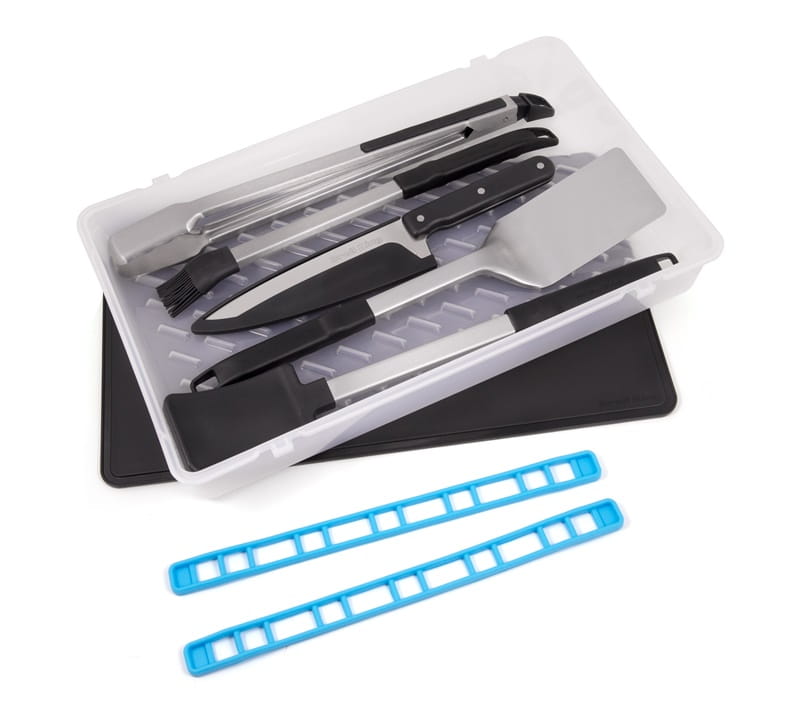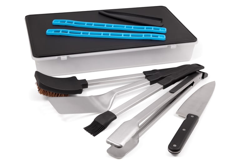 Zestaw do grillowania Porta-Chef jest kompletem który sprawdzi się idealnie na wyjściach w teren, W zestawie znajdziemy pojemnik w którym można zamarynować mięso a po zakończonym grillowaniu zamknąć w nim narzędzia, dwustronna deska do krojenia, nóż, szczotka, łopatka, szczypce oraz silikonowy pędzelek. Komplet zmieści się pod rusztem w grillu gazowym Porta-Chef.